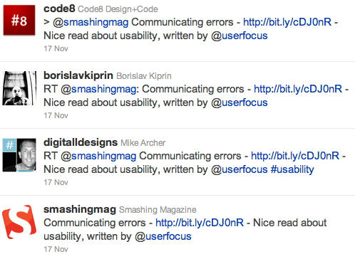 Твиты от @smashingmag ретвитят чаще среднего, так это имя имеет определенный авторитет.