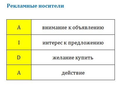 Любая реклама должна привлечь внимание к объявлению. Она должна вызвать интерес к предложению. Само предложение должно вызвать желание купить товар, и должно подтолкнуть человека к желательному действию.