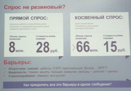 Евгений представии кейс по работе с компанией по привлечению заявок БКС-брокер (фондовый рынок, ценные бумаги, акции облигации). Аудитория, как отметил Евгений, сложная, от новичков до профессионалов. Да и рынок не простой.