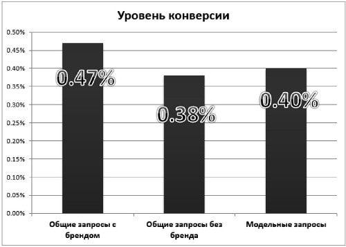 Уровни конверсии зависят от групп запросов, по которым ведется работа.
