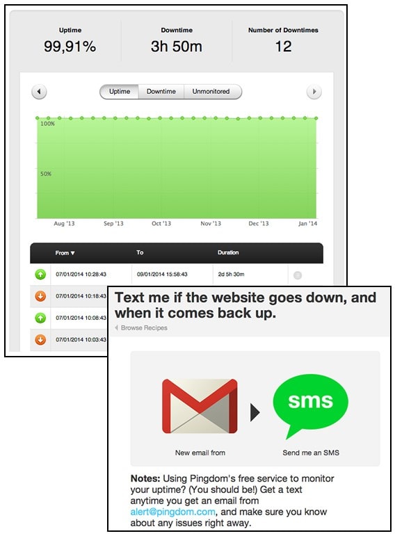 Так как это критично важный момент, существует множество сервисов, занимающихся слежением за доступностью сайта. Такие сервисы, как Pingdom и monitor.us предлагают бесплатные опции, присылают e-mail оповещения, когда сайт «падает», и удобны для небольших сайтов.