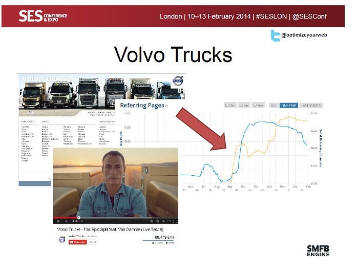 По мнению Кристиана Мар Хауксона, основным преимуществом больших брендов является то, что они не думают о технической стороне продвижения в поиске, уделяя большее внимание маркетингу. В качестве примера успешной имиджевой рекламной интернет-кампании докладчик привел видеоролик, рекламирующий грузовики Volvo с участием Ж.-К. Ван Дамма (Jean-Claude Van Damme).