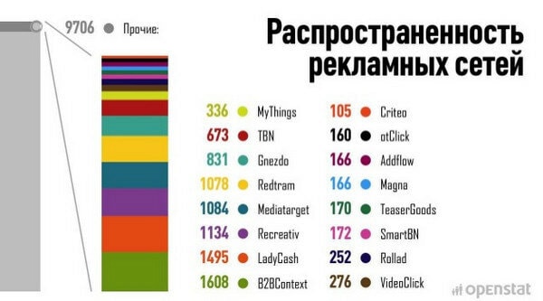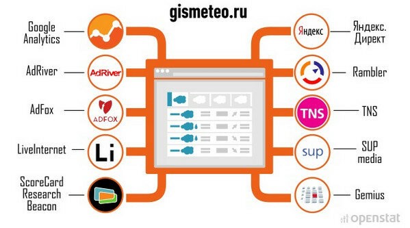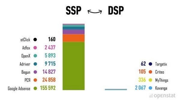 Компания OpenStat исследовала структуру и охват RTB-рынка интернет-рекламы в рунете на основе данных автоматического мониторинга сайтов. Специальный автоматический краулер OpenStat проанализировал 4 млн. 250 тыс. сайтов рунета, изучив скрипты, вставляемые площадками на свои страницы для загрузки SSP. Аналитическая система OpenStat распознает 931 систему по более чем 2200 сигнатурам: рекламные сети, платежные системы, карты, погодные информеры. В ходе исследования было установлено, что большинство площадок в рунете устанавливает на своих страницах сразу несколько кодов, и для каждой из них более-менее характерна такая же картина, которая представлена на всем известном сайта gismeteo.ru, где размещены десять реальных кодов, которые срабатывают: