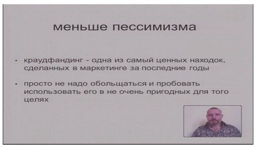 Таким образом, краудфандинг является совершенно не тем, чем кажется. «Кажется, что у вас есть план, и вы сможете собрать на него денег – на самом деле это не так, «народное финансирование» - это иллюзия. Краудфандинг – один из самых прекрасных маркетинговых инструментов, появившихся за последнее время. Его внутренний механизм заметно отличается от того что происходит снаружи. При помощи краудфандинга не надо пытаться собрать деньги», -делится собственным опытом докладчик.
