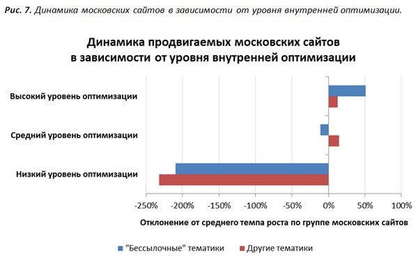 Уровень внутренней оптимизации сайтов (определяемый нами на основе собственного анализатора Wizard.Sape) в «бессылочных» тематиках является весьма значимым фактором роста – более значимым, чем в других тематиках. Между тем, низкий уровень внутренней оптимизации одинаково плохо сказывается на результате во всех тематиках.