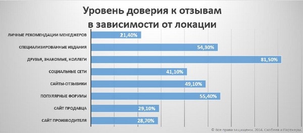 При этом аналитики отмечают тенденцию к серьезному повышению значимости отзывов для покупателей: при покупке следующего предмета крупной бытовой техники «пробьют» отзывы о нем в Сети уже 85,7% респондентов, нового телефона или фотоаппарата – 89,5%, компьютера или оргтехники – 83,5%, игры, фильма или музыкального альбома – 55,6%.