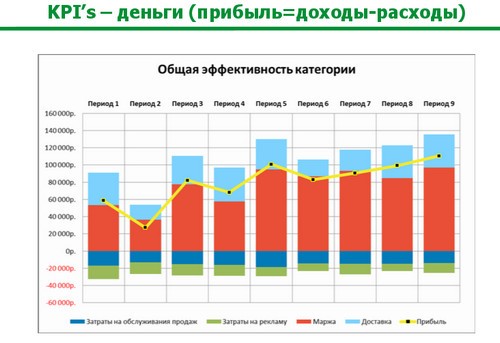 Базовые KPI (ключевые показатели эффективности) следует свести воедино и посчитать. Это можно сделать в простой таблице Excel. В общем отчёте по эффективности сравниваются расходы и прибыль. «При этом полезно визуализировать буквально всё», – подчеркнул Юрий Батиевский.