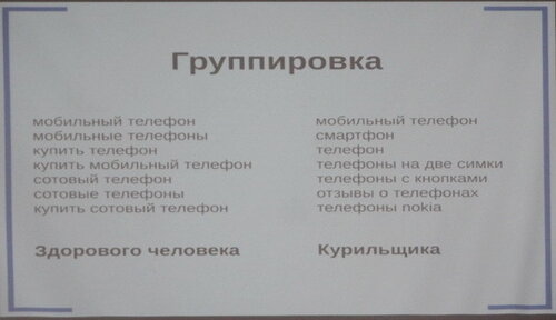 При правильной группировке текст может соответствовать более чем сотне запросов: вхождения помогают друг другу, и текст успешно продвигается по запросам. При неправильной группировке нужно множество вхождений ключевых слов на каждый запрос.