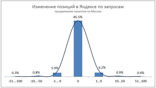 В целом, позиции упали у 77% сайтов (в среднем -11,5 пунктов), рост зафиксирован у 23% (+7,5 пунктов). Динамика ссылочной массы такова: более половины (52%) ресурсов, набрав определённую ссылочную массу, не изменяли её в течение восьми месяцев, у 34% она уменьшилась, у 14% – росла.