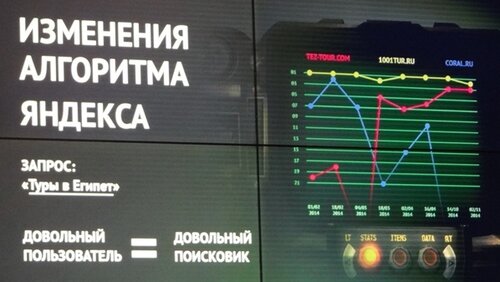 Далее докладчик на конкретных примерах рассмотрел то, как изменялись алгоритмы Яндекса. Так, например, весной 2014 года по запросу «Туры в Египет» компания TEZ.Tour «взлетела» только за счет удовлетворенности пользователей страницей сайта.