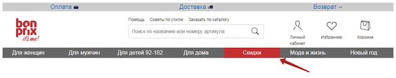 Ссылки на страницы акций/распродаж должны быть в быстром доступе и по возможности выделены другим цветом.