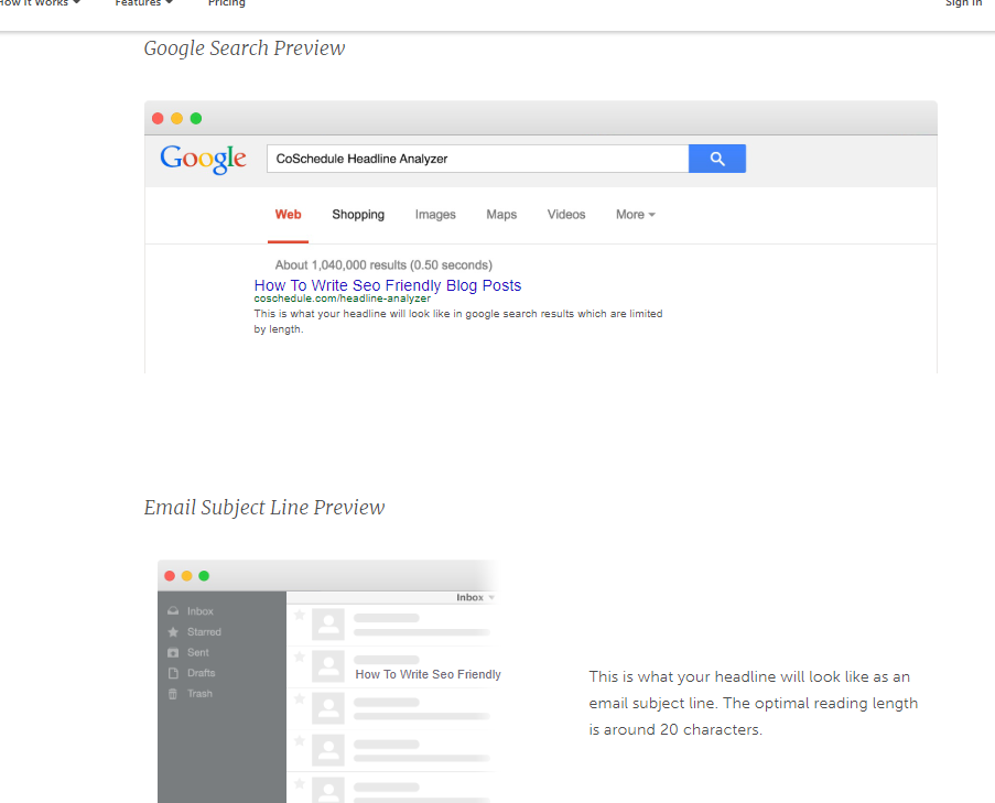 Как только создадите заголовок, оцените его с помощью CoSchedule. Инструмент отображает грамматический анализ, читабельность и длину вашего заголовка. Вы также получите предварительный просмотр в поиске Google и в строке темы электронной почты.
