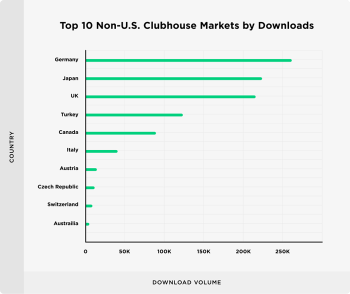 Подавляющее большинство пользователей Clubhouse находятся в США, но рынок быстро растет в Германии, Японии и Великобритании. В других англоязычных странах — Канаде и Австралии — растет количество скачиваний, много первых пользователей сети также среди турецкой молодежи.