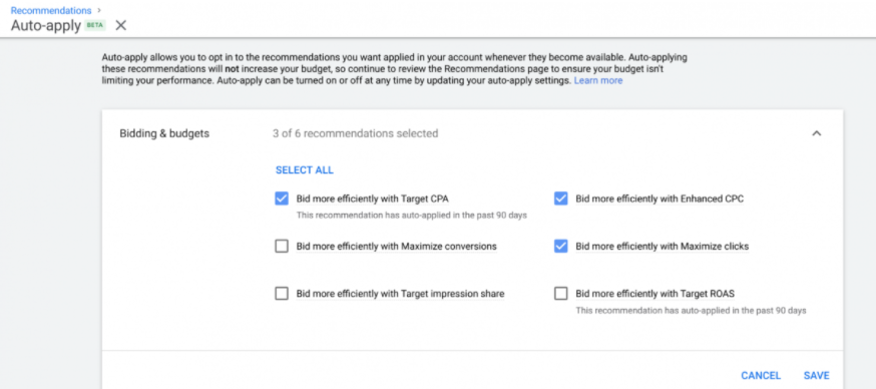 Так как большинство пользователей не хотят тратить время на просмотр рекомендаций и их выполнение, Google представил возможность довериться им и разрешить системе автоматически использовать рекомендации. Так, теперь в инструменте «Рекомендации» у многих рекламодателей появилась новая опция — автоматическое применение.