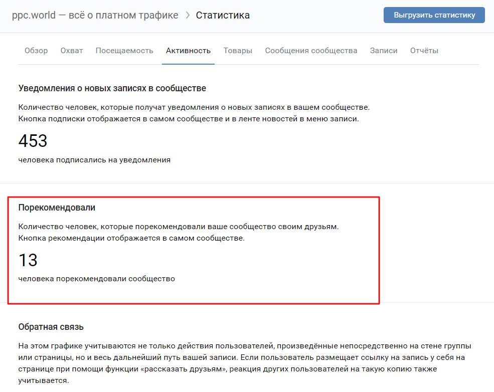 Счетчик рекомендаций находится в разделе «Активность» статистики сообщества.