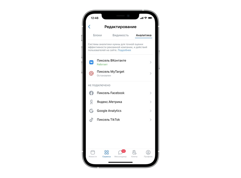 Кроме пикселя ВКонтакте, рекламодатели могут добавлять из конструктора на сайт счетчики и пиксели других систем: TikTok, Facebook, myTarget, а также Google Analytics и Яндекс.Метрики. Чтобы подключить пиксели, нужно перейти во вкладку «Аналитика».
