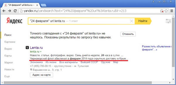 Проверим корректность работы оператора idate еще одним способом. В сниппете одного из предыдущих запросов видна фраза, явно взятая из контента страницы: «Черноморский флот обеспечил в феврале 2014 года скрытную доставку в Крым», – которая, очевидно, является частью одной из новостей: