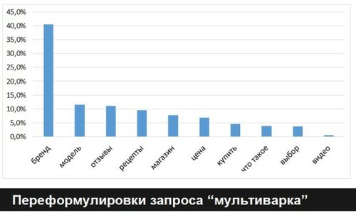 Переформулировка в бренд (т.е. в запросы вида «мультиварки Redmond» и подобные) дает нам представление о сравнительной популярности брендов. Важно, что эта популярность – следствие ознакомления с выдачей, рекламой, результатами поиска.
