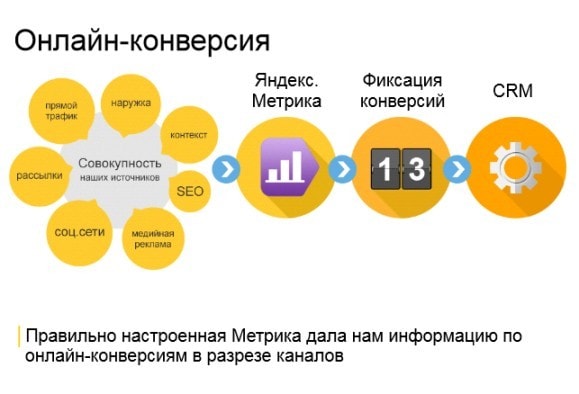 В ходе дальнейшей работы с клиентом анализировали каналы и осуществляли подсчёт конверсий. Данные по каждому каналу тегировали UTM-метками, заводили данные по каждому каналу в Яндекс.Метрику, которая передавала их в CRM. Таким образом, удалось получить информацию по онлайн-конверсиям в разрезе каналов.