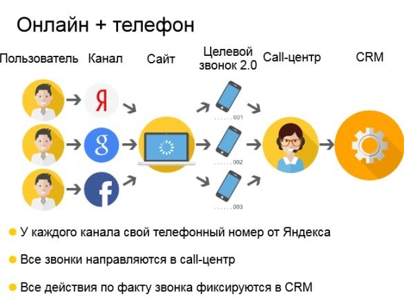 Онлайн + телефонная конверсия происходят следующим образом: посетитель заходит на сайт через определенный канал. Под каждый канал с использованием сервиса от Яндекс Целевой звонок 2.0 проставляется отдельный телефонный номер. Автоматически настроенное ПО Астерикс передает данные из call-центра в CRM. Все действия по факту фиксируются.