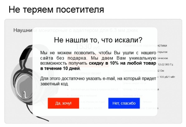 В случае, если пользователь уходит с сайта, ему показывается баннер «Не нашли, что искали…» и далее делается спецпредложение (скидка на любой другой товар) с просьбой оставить свой e-mail или номер мобильного телефона:
