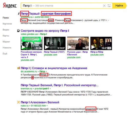 Для удобства и понятности оформление результатов выдачи поисковыми системами происходит через подсвечивание в сниппетах некоторых слов и/или фраз. Зачастую, это слова из ключевого запроса, которые мы вводим в строку поиска. Помимо ключевых запросов в сниппетах также выделяются слова, которые в самом запросе не содержатся. Дополнительные слова машина получает, анализируя переформулировки запросов. Эти слова и являются спектральными синонимами.