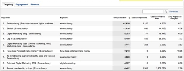 Отчёт, созданный специалистами eConsultancy, анализирует наиболее популярные (и доступные) поисковые запросы, ведущие на сайт. В нём также содержатся такие метрики, как показатель конверсии, количество достигнутых целей и время загрузки страницы по каждому ключевому слову.