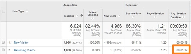 Обычно, вернувшиеся пользователи задерживаются на сайте дольше, и по ним наблюдается более низкий показатель отказов: