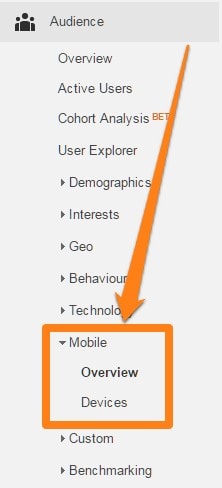 Для доступа к отчёту нужно последовательно выбрать: Аудитория -> Мобильные устройства -> Обзор. В англоязычном интерфейсе сервиса это выглядит так: