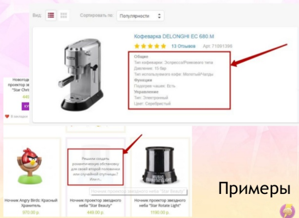 Ещё один метод, который нельзя отнести ни к искусственному, ни к естественному – генерация текстовых фрагментов. Подход применим для листингов любого типа. С этой целью необходимо добавить важные технические характеристики товаров. Метод подходит для продвижения коммерческих тематик. Также можно добавлять мини-анонсы. Этот способ подходит не только для информационных тематик, но и для коммерческих с эмоциональным подтекстом. Так, например, специалисты компании Эльдорадо по запросу [кофеварки] добавили описания функций разных моделей.