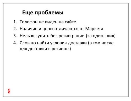 Цена. Бывает ситуация, когда на «Маркете» товар есть, написано, что в наличии, цена такая-то - кликает человек, переходит, а там уже неправильная цена. Одно дело, если «Маркет» не успел обновиться, но если который день на сайте висит цена неправильная или неверные данные о наличии (написано «предзаказ»), это надо фиксить.