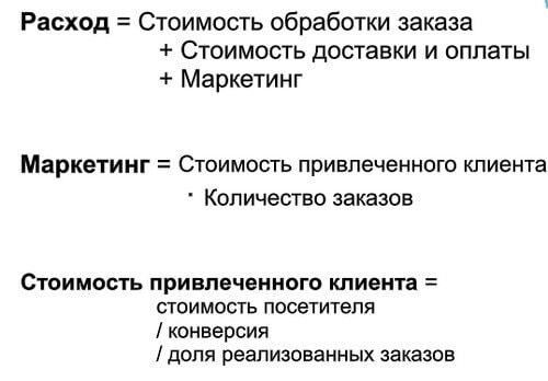 Начнем с простого. Все знают, что прибыль – это доход минус расход. Доход у нас равен разнице между объемом продаж и стоимостью товаров. И еще есть общий расход, в который входит стоимость обработки заказов, стоимость доставки, проценты с оплаты и расход на маркетинг. Значит, все эти вещи, легко можно примерно посчитать. Оперативные, ежемесячные.