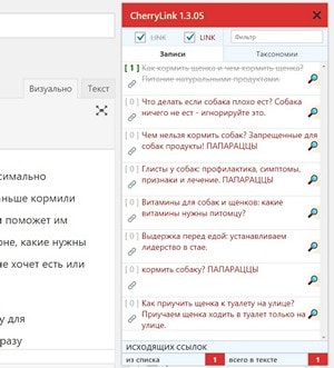 Плагин CherryLink добавляет панель справа от редактора статьи, в которой выводит релевантные ссылки данному тексту (картинки кликабельны):