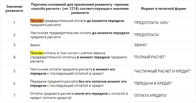 Нас в частности интересует реквизит «признак способа расчета» (тег 1214). Значения этого реквизита и перечень оснований для присвоения ему соответствующих значений указаны в таблице 28 Приложения 2 к Приказу ФНС N ММВ-7-20/229@ (в ред. Приказа ФНС России от 09.04.2018 N ММВ-7-20/207@)."