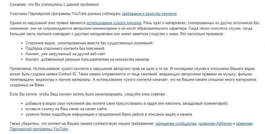 полазив по самому "форуму" ютуб и видя какие люди каналы присылают (а там большинство авторских например - человек сидит перед монитором и рассказывает об кулинарии и тому подобное) даже вставок никаких нет, и ему отключили монетизацию