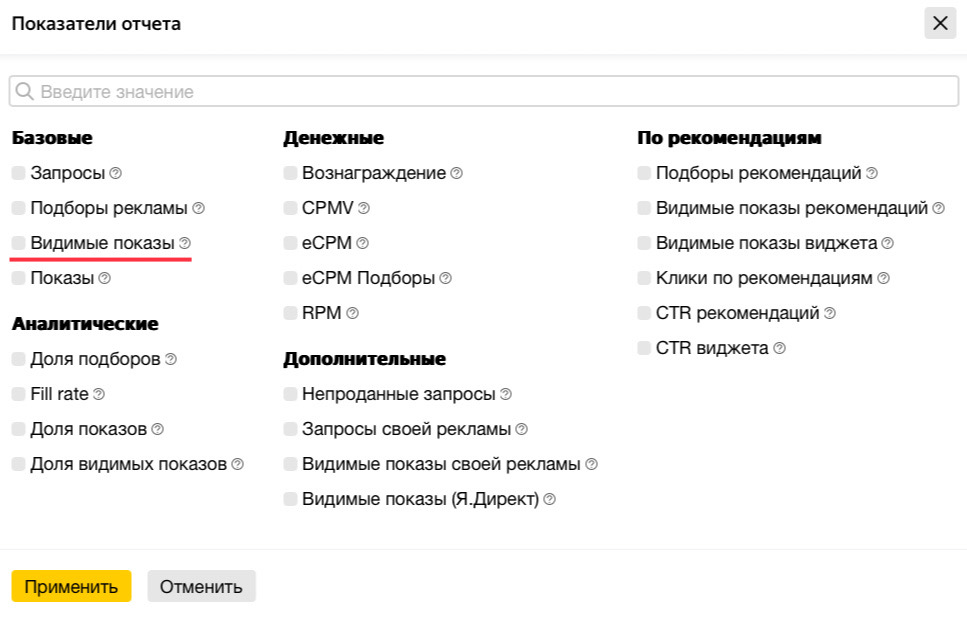 Заходите: Статистика > Показатели и выбираете «Видимые показы», затем «Применить», далее «Построить отчет».