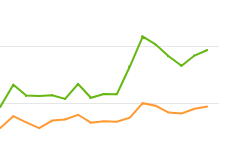 На примере ниже я перенастроил некоторые старые блоки по "хитрой схеме". Яндекс вроде как повёлся и значительно увеличил CPMV (зелёный график) и можно было бы уже идти хвастаться на форумы, чтобы все не ныли, а продолжали работать, но по факту eCPM (оранжевый график) почти не вырос, т.е. за "правильные" настройки никто платить мне там не собирается.