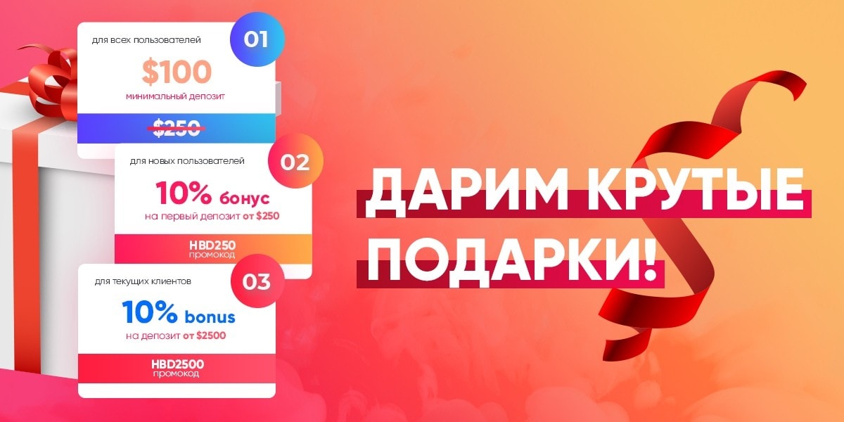 2. Бонус 10% для новых пользователей.*Зарегистрируйтесь, внесите депозит и сообщите промокод своему аккаунт-менеджеру. Вскоре промокод будет добавлен в ваш аккаунт.