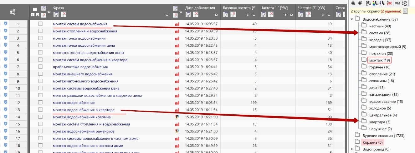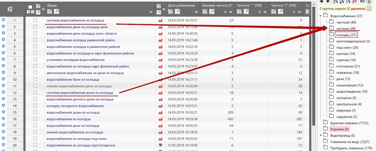 Что крайне необходимо для учета частотности фраз, которые распределяются по группам. Для более эффективной и стабильной работы рекламы лучше оставлять в группе 5-6 схожих по тематике ключевых фраз и несколько вариантов объявлений. Можно даже объединить группы «Колодец» и «Система», если тематически разницы в них нет.