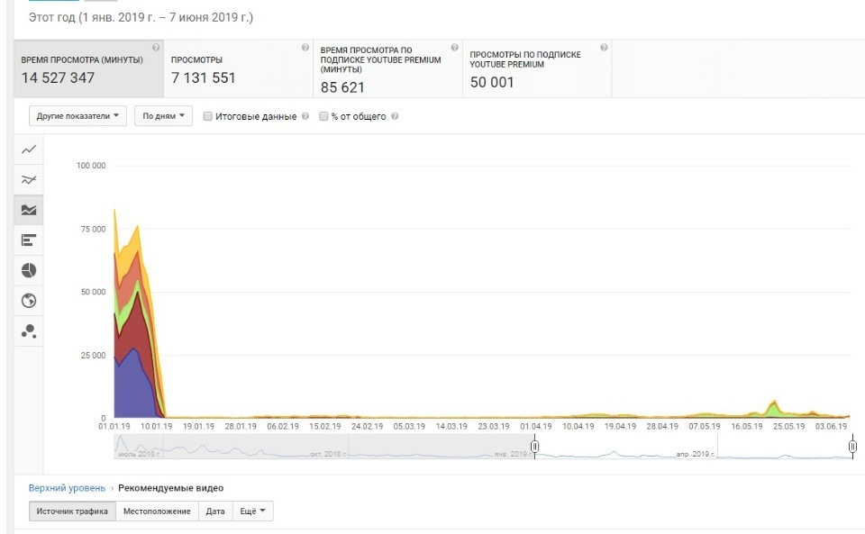 Это не скакнуло в начале - это был обычный процент траффика с Рекомендуемых - мин 70 %, который держался стабильно все 4 года существования канала.
