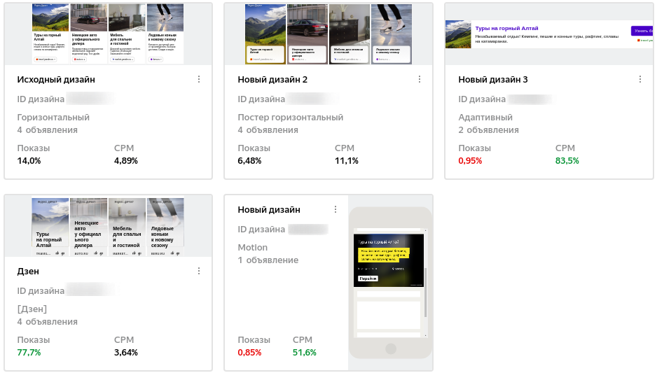 В таком наборе они уже больше 2 недель. Если я правильно понял, то 3 дизайн и Motion должны показываться в максимуме, а показывается почему-то Дзен с минимальным СРМ...
