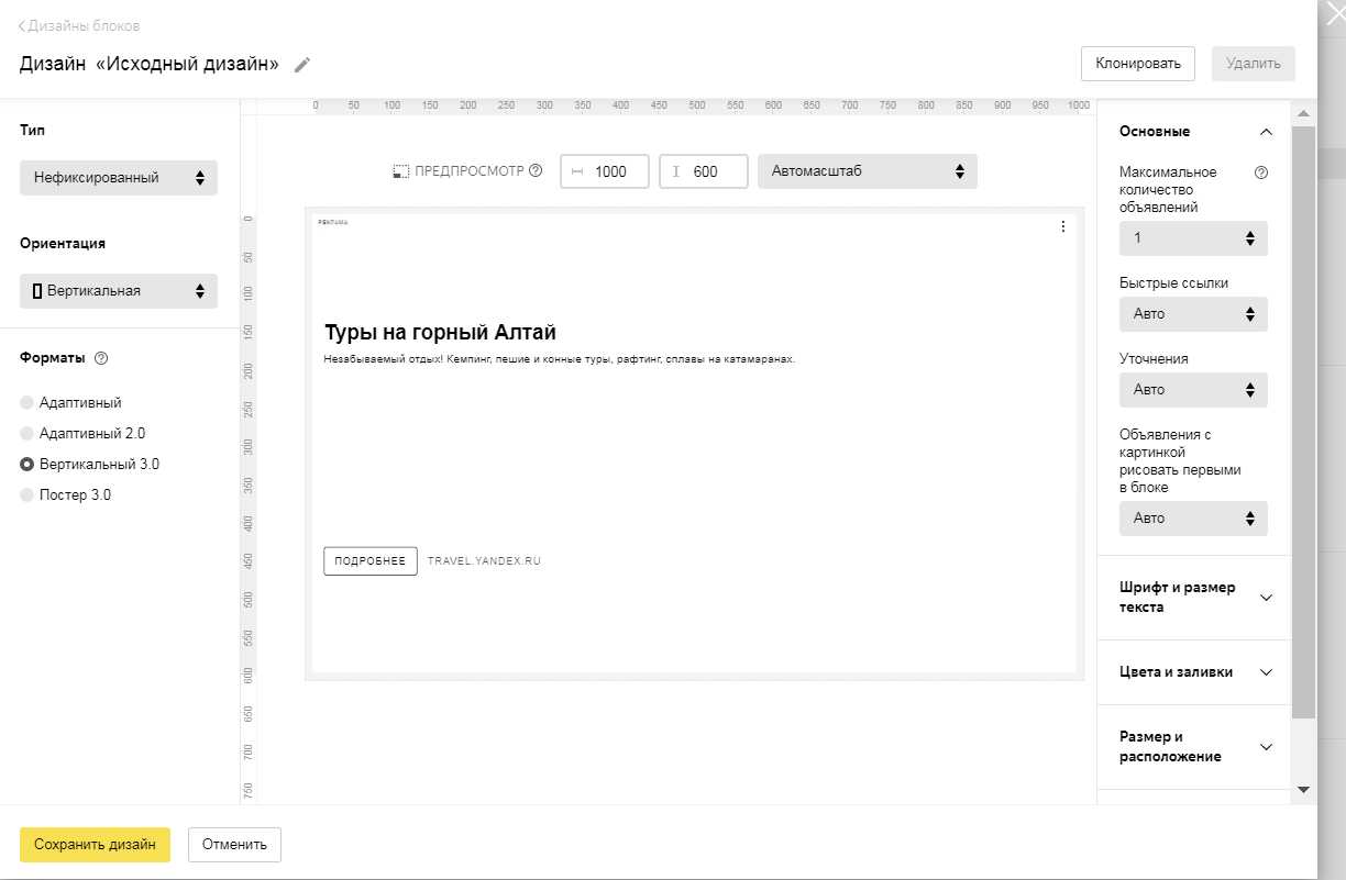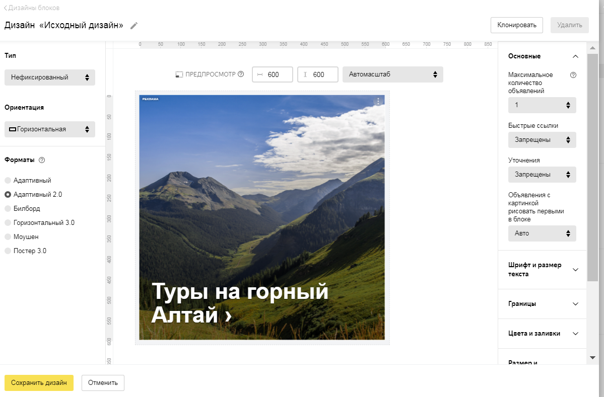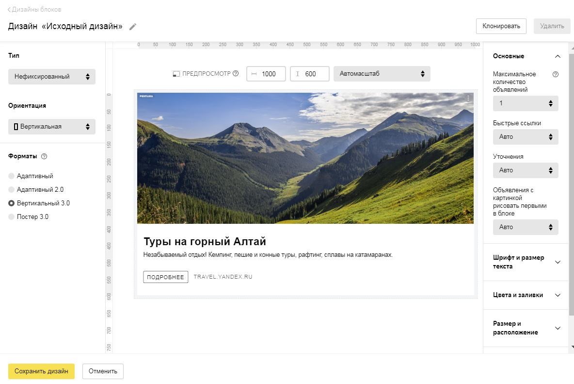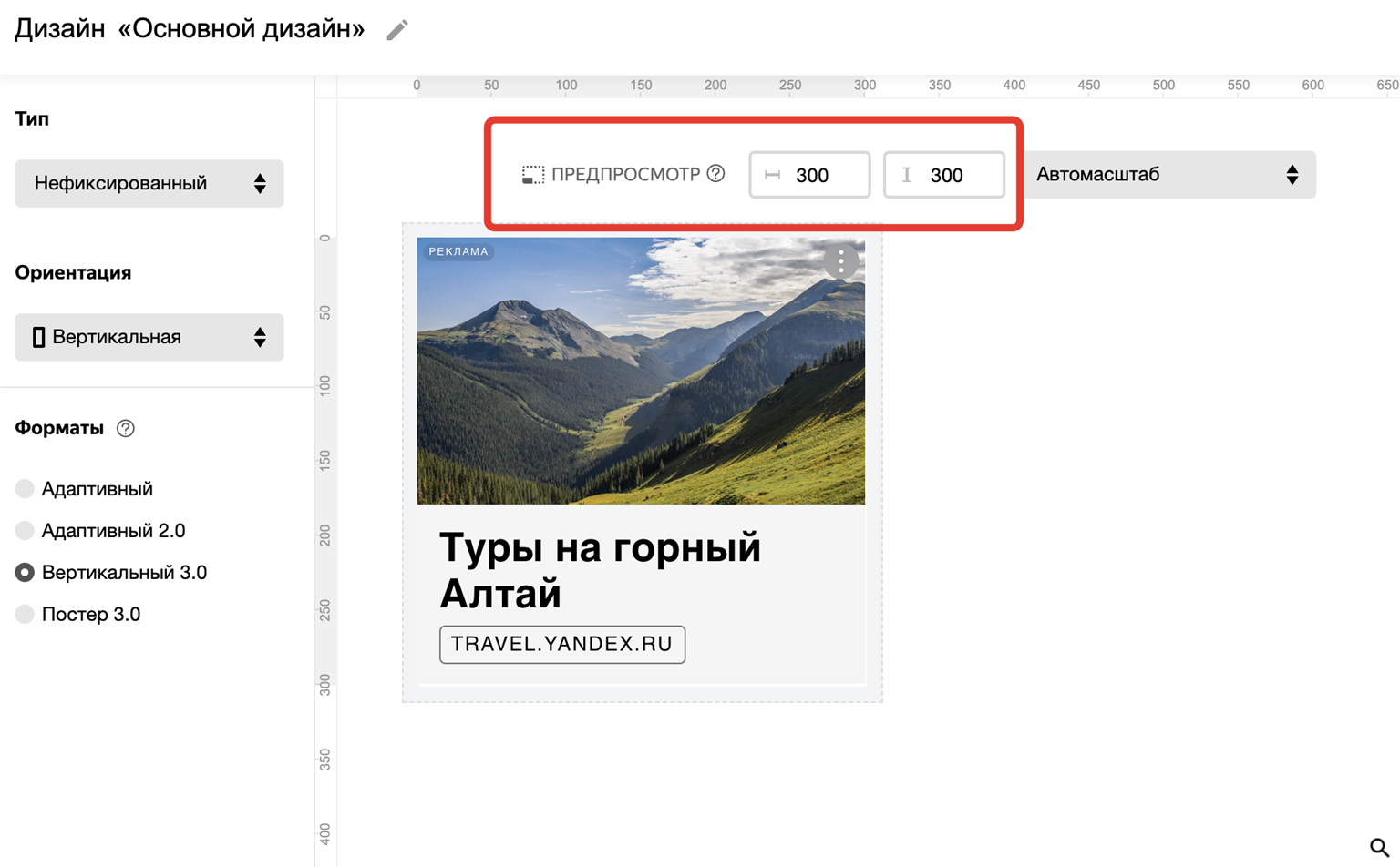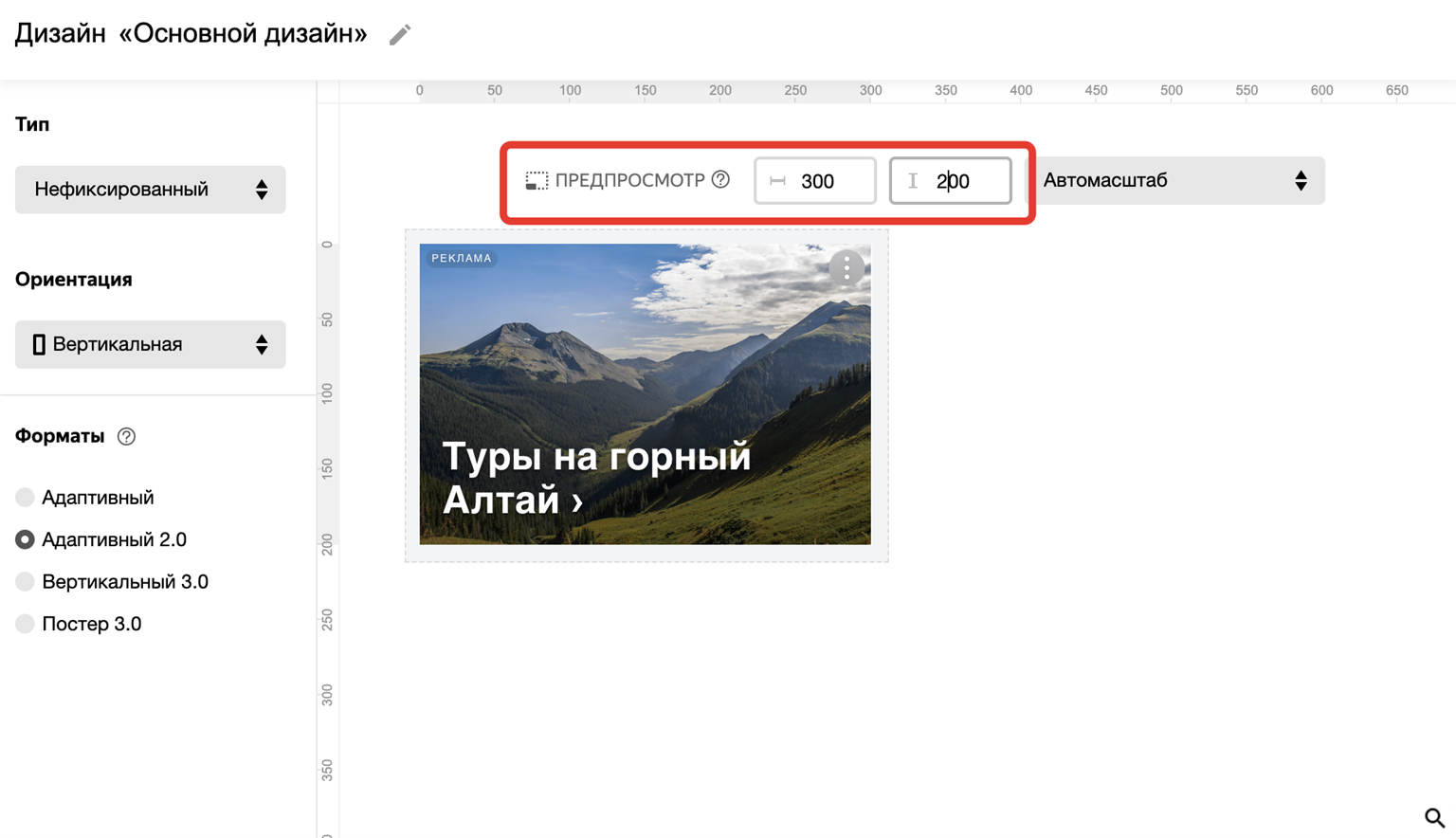 Вы можете поменять размер блока в окне предпросмотра. Эта область просмотра — тестовый контейнер для того, чтобы проверить как будет выглядит рекламный блок на сайте.