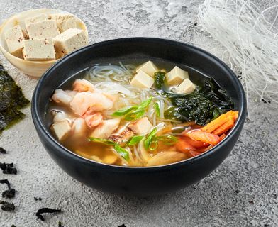 Вакаме, Крахмал, Кунжут, Курица, Лапша фунчоза, Лук репчатый, Масло кунжутное, Морковь, Перец болгарский, Соус чили, Тигровые креветки, Тофу