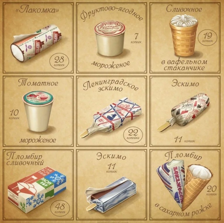 Вот все что на картинке было. Не всегда, но почти всегда. Всегда было за 48 копеек, иногда 2-х видов - с крошкой шоколадной и без. И брикеты обложенные 2 вафлями, но они не котировались.