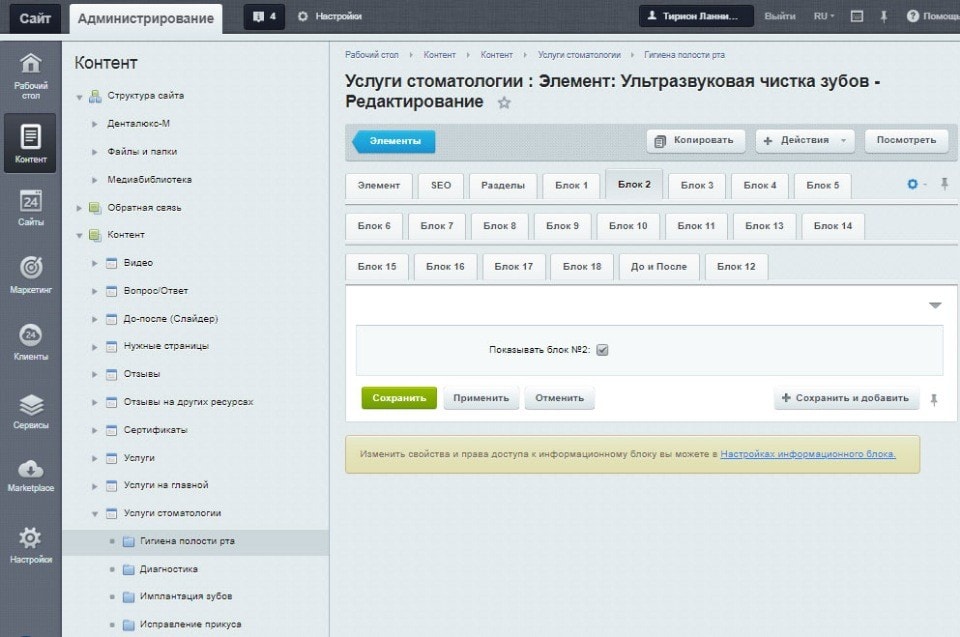 Вот, к примеру, "Блок 2", в нём фото, фио и тел. врача, но в админке он просто "Блок 2", который я могу включить или выключить, поставив в чекбоксе галочку.