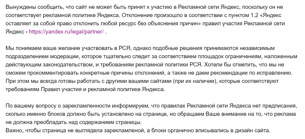 Сначала РСЯ решили шейвить, а теперь когда рекламы на всех не хватает отключают сайты, чтобы забирать все себе? Ну в целом классический бизнес по русски. Отключили самый качественный сайт, остальные оставили. Хорошо, что год назад перешел в бурж. Сегодня сообщение прилетело. Решил зайти сюда.