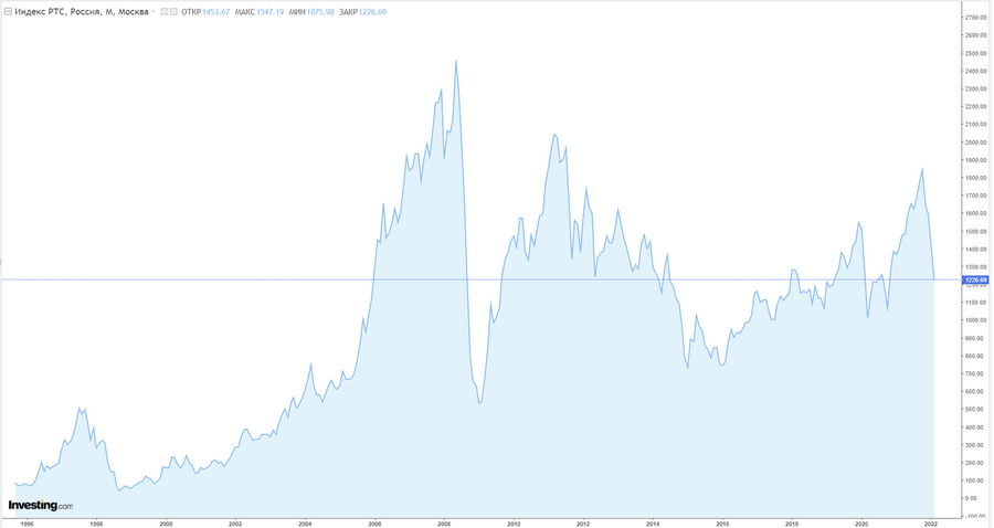 Во-первых, ты не Нострадамус, во-вторых ноль, только в случае если портфель состоит на 100% из акций и нет ни продаж перед кризисом, ни закупок после обвала акций на дне. Вложения в гос облигации США и золото давали огромный доход с 2000 до 2010 года, что с лихвой компенсировало бы стагнацию американских акций в этот период. Правильно подобранный хедж и можно пережить любые кризисные времена находясь в американских акциях и при этом даже получая доход, несмотря на кризис. А вот с российскими акциями можно так влететь, что мало не покажется и в минусах сидеть будешь много лет. Индекс РТС в долларах до сих пор не восстановился до уровня 2008 года ! Вы видели индекс Бразилии, индекс Канады, индекс Израиля , индекс Австралии и др. ? Сравните их с российским индексом РТС и удивитесь насколько они лучше. Если уж Америка не устраивает, то вокруг столько стран где доходность стабильная и растущая , а вы выбираете инвестирование в страну находящуюся под санкциями с вялотекущим ростом за последние 14 лет ! Ну смешно. Это просто слепой патриотизм не более того, просыпайтесь уже ! Я тоже таким раньше был, но сейчас протрезвел и осознал реальность.