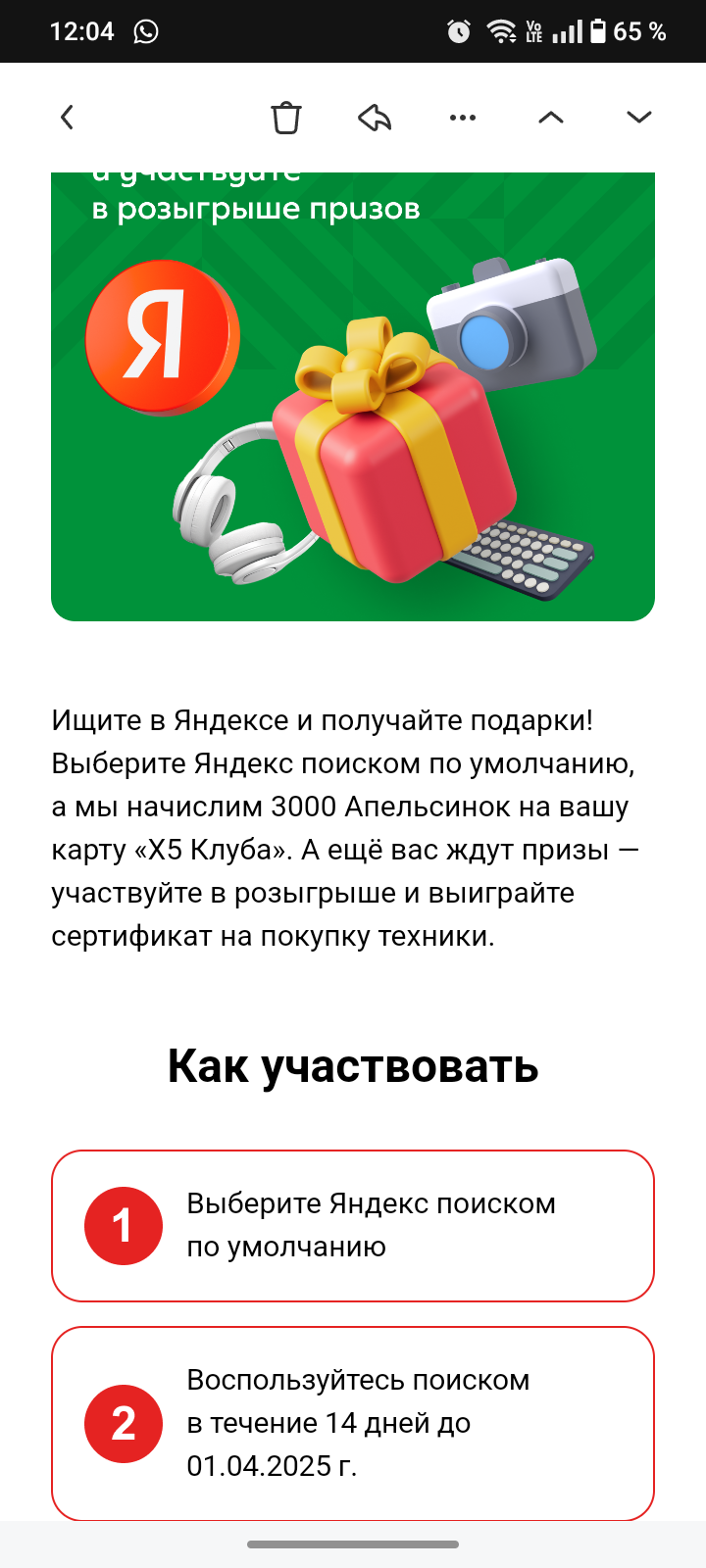 Вот так Яндекс зазывает пользователей своего поиска. Видно совсем плохо. Реально многие перешли в Гугл. Если что, это рассылка из пятерочки.