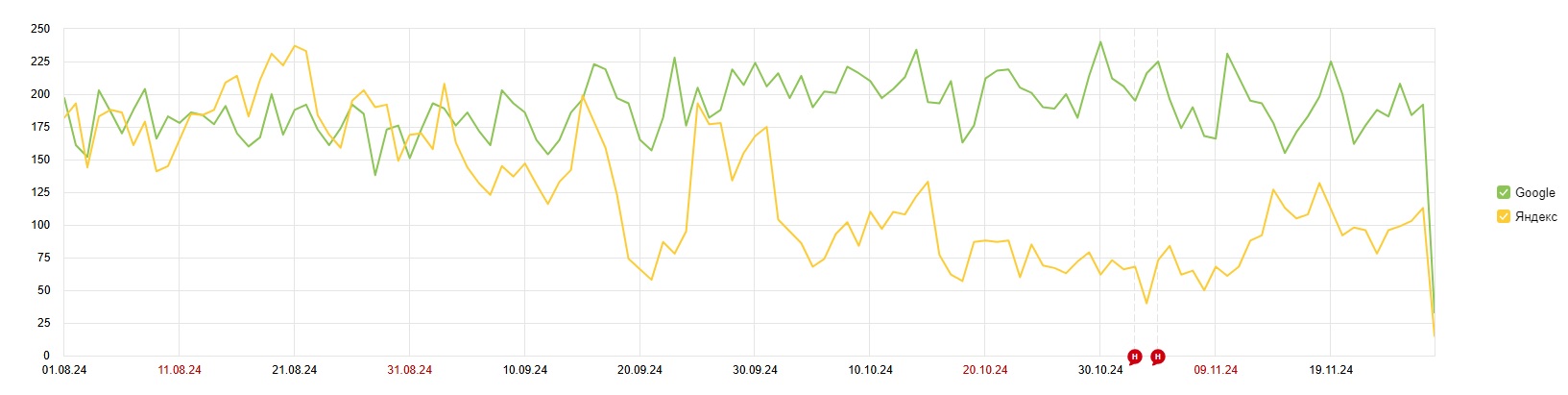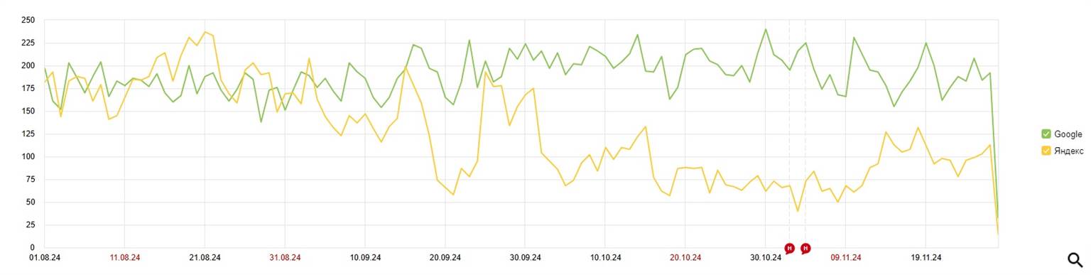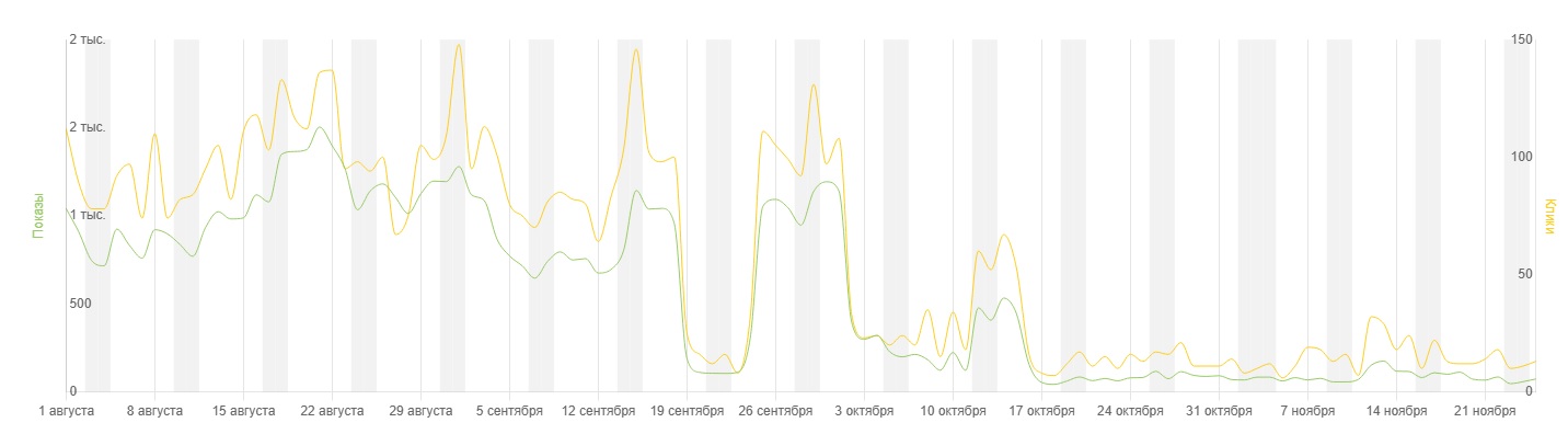 Статистика поисковых запросов. Сотни показов и кликов одним днем 19 сентября упали почти в 0, 25 сентября все возвращается обратно, 2 октября снова падает в 0, 12 октября возвращается частично и 17 октября падает снова на дно и находится там по сей день. На этом дне показов менее 100, кликов до 20 ежедневно.
