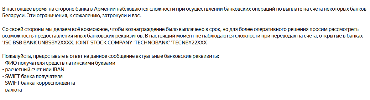 Здравствуйте. Как уже отвечал в этой ветке, в настоящий момент есть сложности на стороне банка в Армении при осуществлении банковских операций по выплате на счета некоторых белорусских банков. Со своей стороны мы делаем всё возможное, чтобы вознаграждение было выплачено в срок. Сейчас не наблюдается сложностей при осуществлении банковских операций у следующих банков: «JSC BSB BANK UNBSBY2XXXX» и «JOINT STOCK COMPANY 'TECHNOBANK' 'TECNBY22XXX». Поэтому рекомендуем рассмотреть возможность предоставить нам другие банковские реквизиты.